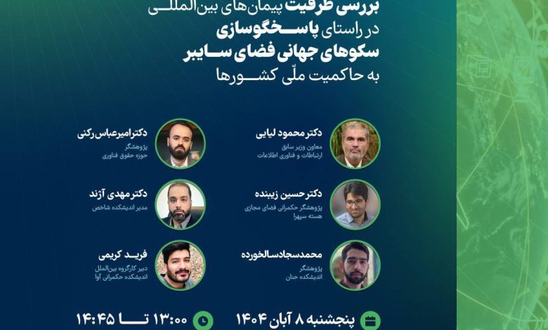 بدین وسیله به اطلاع میرساند پنل «بررسی ظرفیت پیمانهای بینالمللی در راستای پاسخگوسازی سکوهای جهانی فضای سایبر به حاکمیت ملی کشورها» در چهارمین کنفرانس دیپلماسی سایبری مورخ پنجشنبه ۸ آبان ۱۴۰۴ ساعت ۱۳:۰۰ الی ۱۴:۴۵ در کتابخانه مرکزی دانشگاه تهران برگزار خواهد شد.